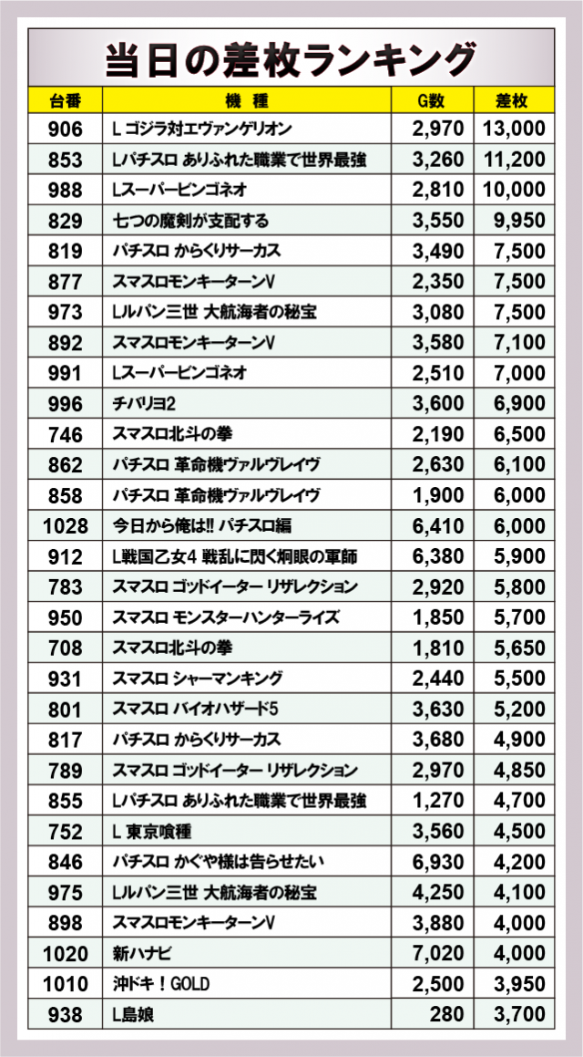 『L ゴジラ対エヴァンゲリオン』『Lパチスロ ありふれた職業で世界最強』『Lスーパービンゴネオ』にて万枚OVERが飛び出し、凄まじい熱気が店内を包み込みこんでいた。また『七つの魔剣が支配する』で万枚に迫る+9,950枚をマーク!何よりも上表は3,000枚OVERから名を連ねているため、ファンは高揚感を抑えきれなかったことだろう。