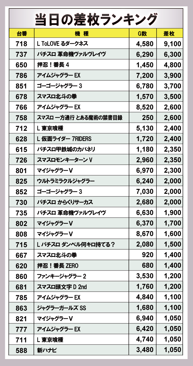惜しくも万枚には届かなかったが、『L ToLOVEるダークネス』から+9,100枚!次いで、『パチスロ 革命機ヴァルヴレイヴ』から+6,300枚!さらに、『押忍!番長4』から+4,800枚など上位はスマスロ勢が占めているが、ランキング内の約半数はジャグラーシリーズとなっており、同店が力を入れていた様子が窺える。