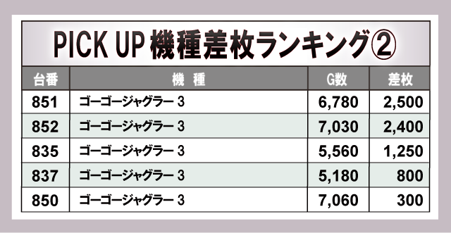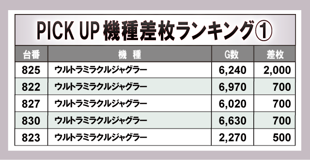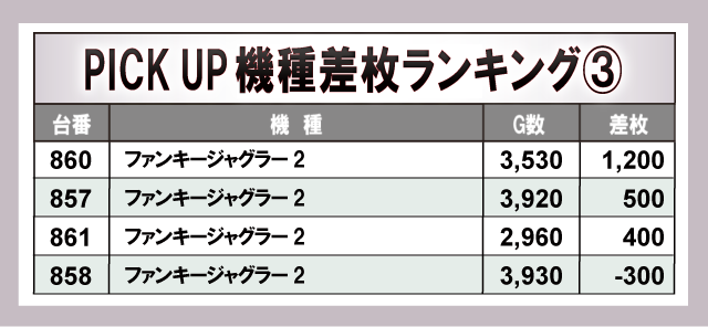 今回、PICKUP機種となったのは上の4機種だ!差枚ランキングでも触れたように、やはり『ジャグラー』シリーズが中心となって同店を大きく盛り上げたようだ!G数からもファンが自信を持ってレバーを叩いていたことが分かる。