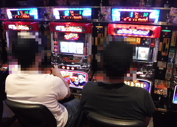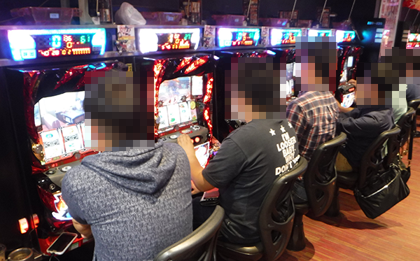開店直後のパチスロにおいては、「バジリスク~甲賀忍法帖~絆」や「押忍!番長3」など、多数の機種が満席。