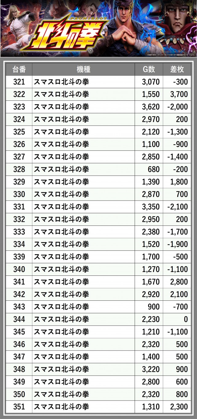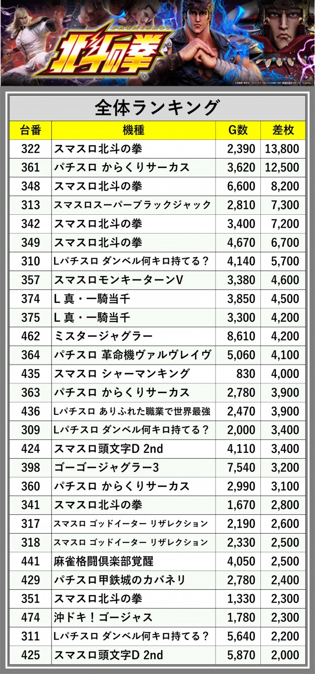 ※差枚数順に掲載しています
