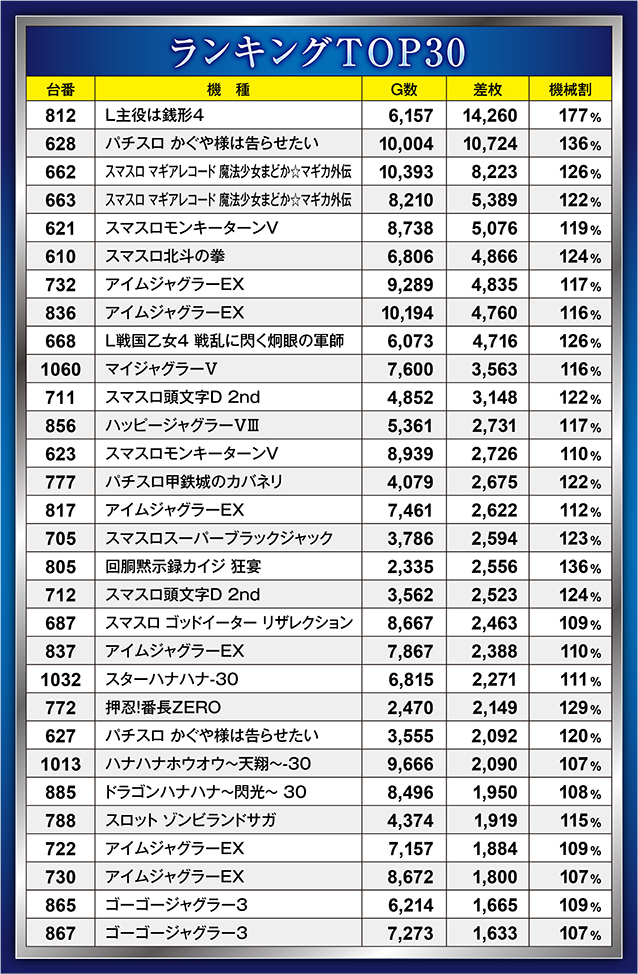 今回、ランキング1位の座に輝いたのは、おそらく誰もが本命視していなかったであろう『L主役は銭形4』。その差枚は14,000枚超え、機械割は177%という文句なしの結果だった。また、『パチスロ かぐや様は告らせたい』からも10,000枚超えが誕生、3・4位には『スマスロ マギアレコード 魔法少女まどか☆マギカ外伝』が連続ランクイン!
