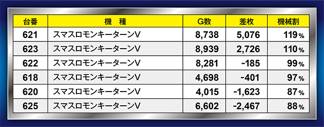 前回と同じく、プラス台は2台のみという結果に。それでも621番台は安定した挙動で5,000枚オーバーを達成し、人気マシンとしての意地を見せつけた。