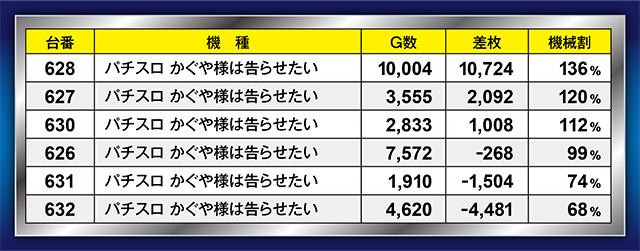 628番台から10,000枚オーバー記録が飛び出し、相変わらずの地力を証明した『パチスロ かぐや様は告らせたい』。残りの台からは3,000枚超えが出ることはなかったものの、まずまずの結果と言っていいだろう。
