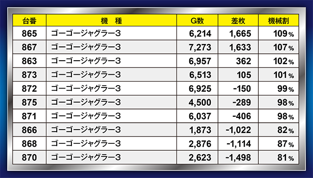 今ひとつ、伸び悩んだ感のある『ゴーゴージャグラー3』。その要因はプラス台数および3,000枚超えレコードが生まれなかったこと。次回の巻き返しに期待したい。