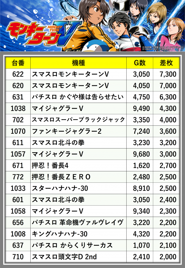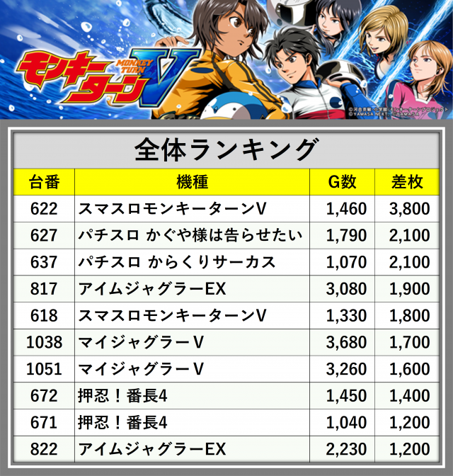 ※差枚数順に掲載しています