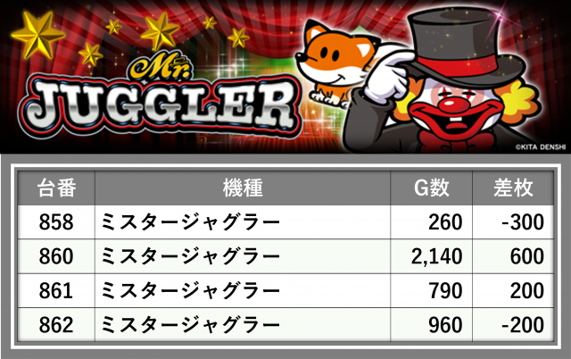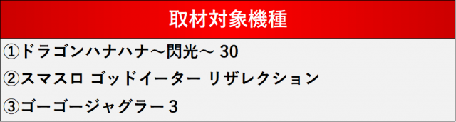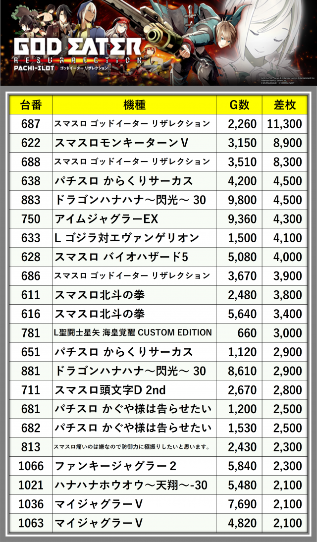 厳選された取材対象機種をはじめ、その他スロット全体から好記録が飛び出した!プレイヤーが楽しんだ1日を下記データにて振り返ってみて欲しい。