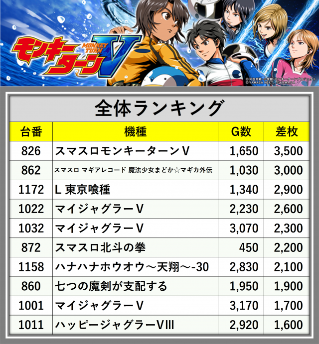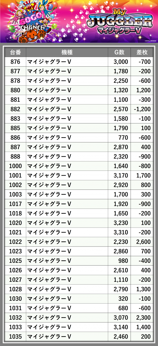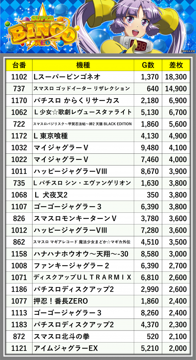 厳選された取材対象機種をはじめ、その他スロット全体から好記録が飛び出した!プレイヤーが楽しんだ1日を下記データにて振り返ってみて欲しい。