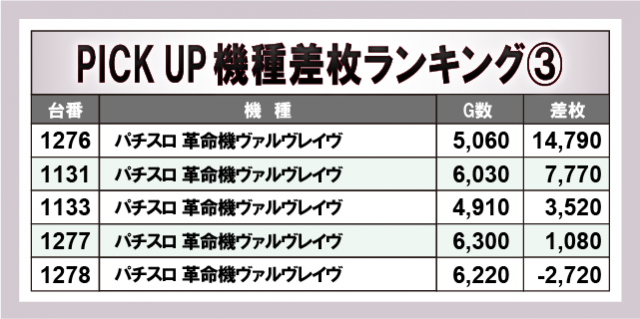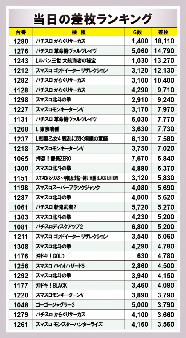 2台の万枚OVER台が発生した『パチスロ からくりサーカス』を筆頭に『スマスロ北斗の拳』『パチスロ 革命機ヴァルヴレイヴ』『スマスロモンキーターンV』『スマスロ バイオハザード5』といったスマスロ人気機種から4桁差枚を複数放出し、打ちごたえのある状況が整っていた。これら優秀機種を中心に店内は凄まじい熱気が放たれており、ファンは大きな手応えを手にしていたことだろう。
