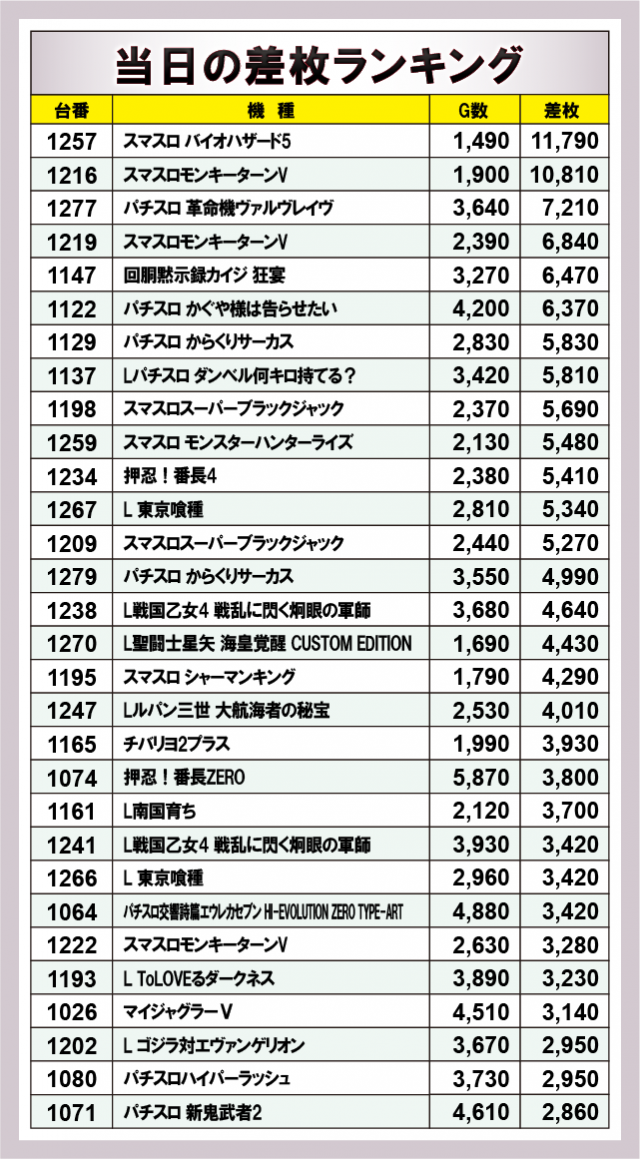 『スマスロ バイオハザード5』『スマスロモンキーターンV』から万枚OVERが発生し、店内の盛り上がりをリードする存在となっていた。さらにスマスロ機を筆頭に5,000枚OVERが多数発生しており、各所で凄まじい熱気が放たれていた。またTOP30台のうち27台が3,000枚OVERからとなっていることも館内の熱量を窺える内容となっており、ファンは至福のひと時を過ごしていたことだろう。