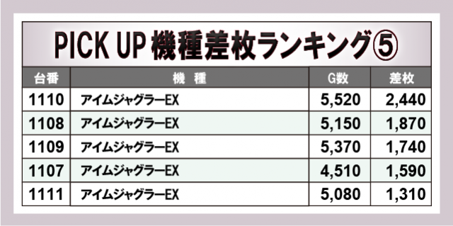 当日とくに店内を盛り上げた機種は上表の5機種。人気のスマスロ機を中心に叩きがいのある状況が整っており、まとまった出玉を獲得する台が多数発生した事実は同機種たちのポテンシャルの高さを窺え、訪れたファンたちのニーズに応える結果となっている。