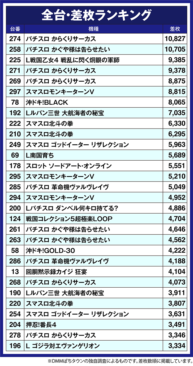 ほかにも、「スマスロモンキーターンV」の297番台や「沖ドキ!BLACK」の78番台が8,000ptを超えた。
