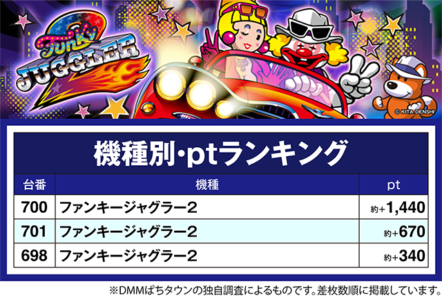 「ファンキージャグラー2」も3台が結果を残し、700番台が約+1,440ptを超えた。
