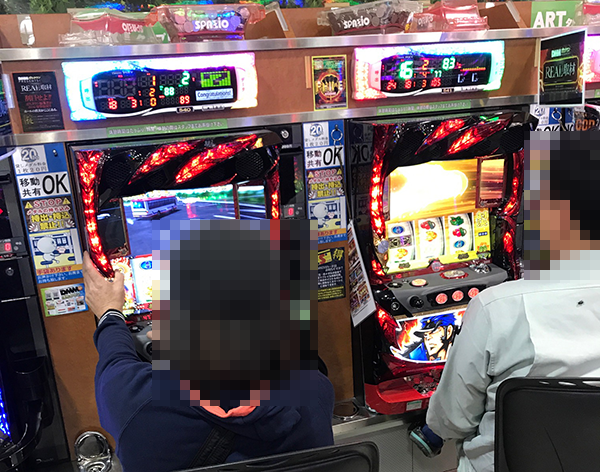 14時頃のパチスロにおいて、人気を集めていたのが「バジリスク~甲賀忍法帖~絆」と「押忍!番長3」。遊技を楽しむプレイヤーたちは明るい表情をみせており、機種の魅力を堪能できていたようだ。