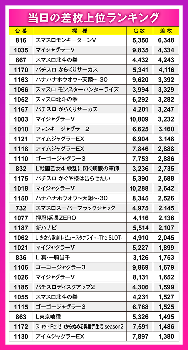 前回(3月3日)は2位に甘んじた『スマスロモンキーターンV』が、この日は首位の座に浮上!6,000枚を上回る記録でこの日の頂点に立った。驚くことに、2位には4,000枚超えレコードで『マイジャグラーⅤ』がランクイン!『スマスロ北斗の拳』や『パチスロ からくりサーカス』などの強力マシンを抑えての2位入賞を果たした。