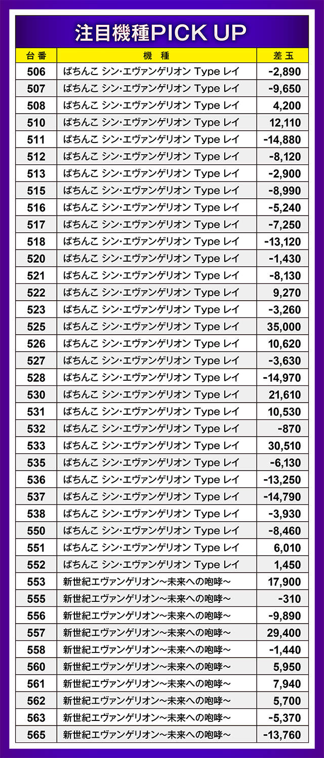 パチンココーナーでは、この日も『エヴァンゲリオン』シリーズの結果に注目。推しの日取材の度、10,000玉を超える差玉結果が生まれているが、この日も例外ではなかった。10,000玉を超える結果は計8台!その中には2台の30,000玉超えレコードが含まれていたことを付け加えておこう。