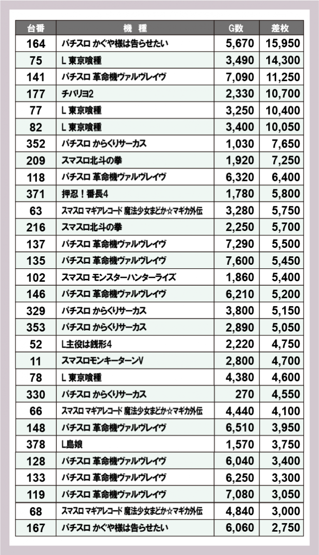 ※差枚数順に掲載しています