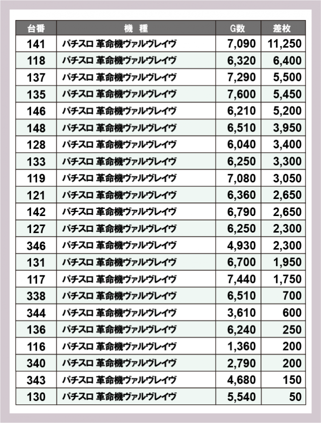 ヴァルヴレイヴ差枚ランキング