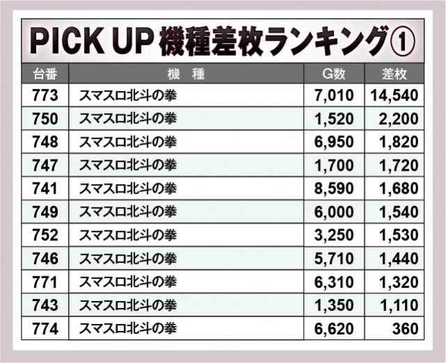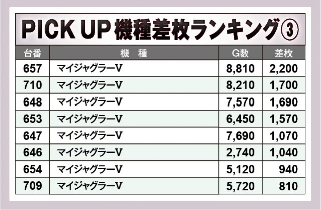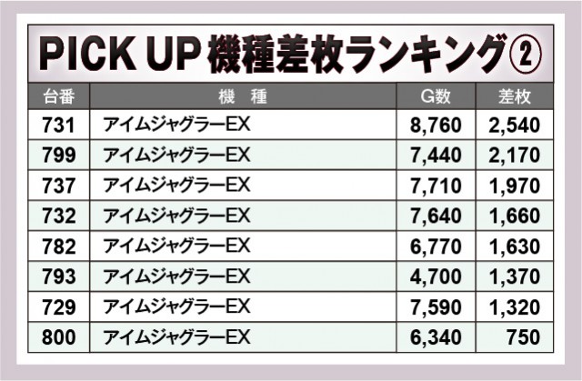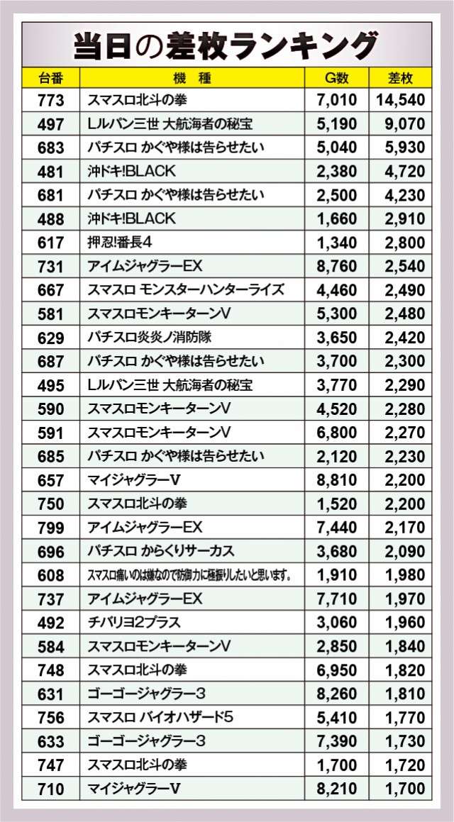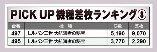 『スマスロ北斗の拳』にて万枚OVERが飛び出し、さらに『Lルパン三世 大航海者の秘宝』では9,000枚OVERが生まれるなど、店内に大きな熱気が飛び出した。他にもまとまった出玉を確保する台が見られ、遊技していたファンは高揚感を抑えきれなかったことだろう。AT機の活躍は当然、そこに『アイムジャグラーEX』『マイジャグラーⅤ』も名を連ねた事実から、スペック問わず活躍していた1日と言えるだろう。