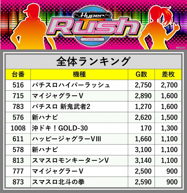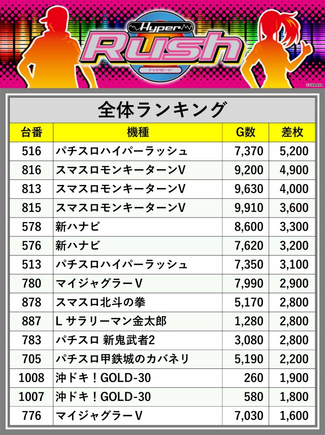 厳選された取材対象機種をはじめ、その他スロット全体から好記録が飛び出した!プレイヤーが楽しんだ1日を下記データにて振り返ってみて欲しい。