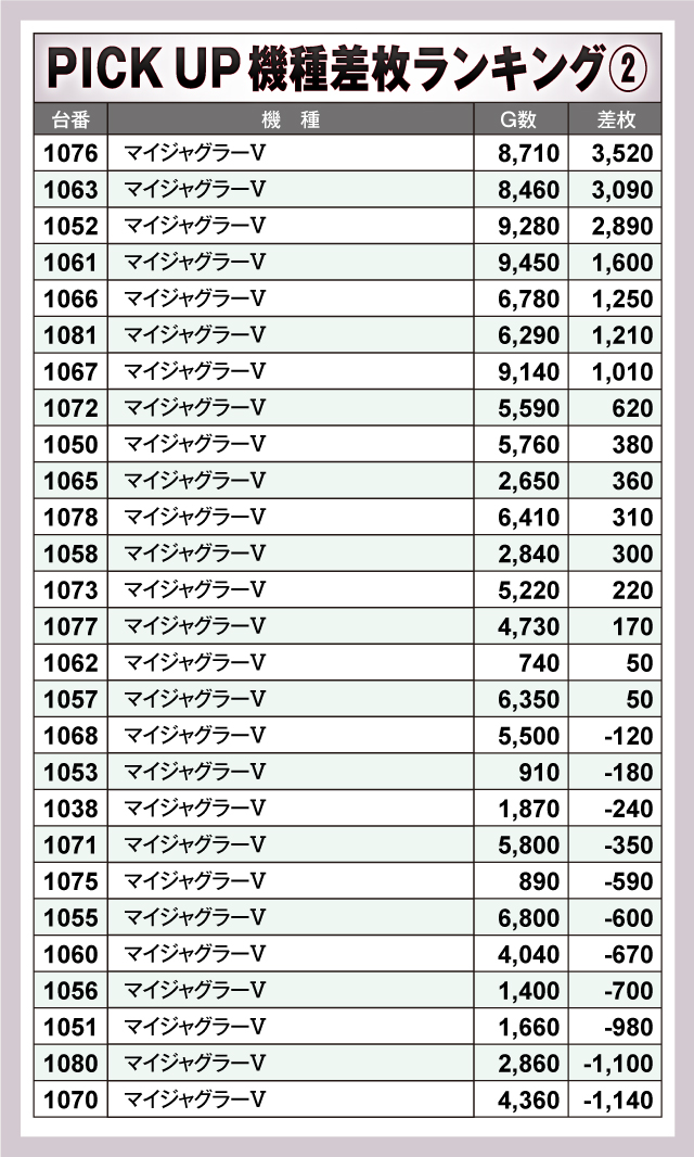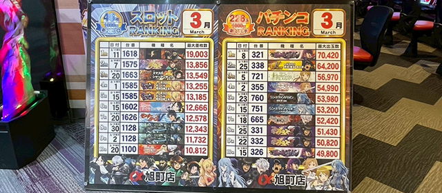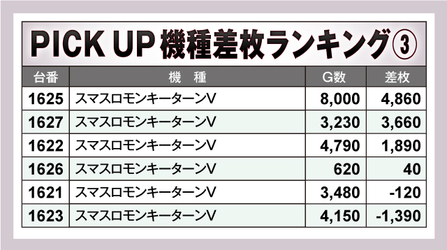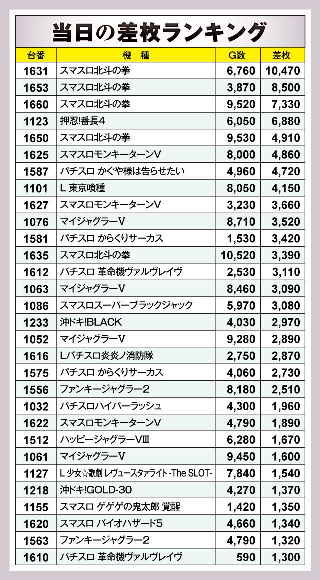 つづいて『押忍!番長4』1123番台が+6,880枚。『スマスロモンキーターンV』1625番台を含む4台が4,000枚オーバー。『マイジャグラーⅤ』1076番台など7台が3,000枚オーバーと、優秀台がひしめき合う圧巻のランキングが完成していた。