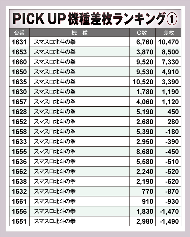 首位どころか3位までを独占したのが『スマスロ北斗の拳』。1631番台が+10,470枚、1653番台が+8,500枚、1660番台が+7,330枚と驚異的な成績を残している。