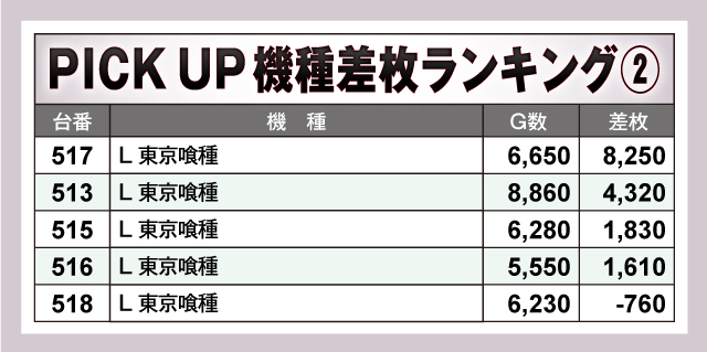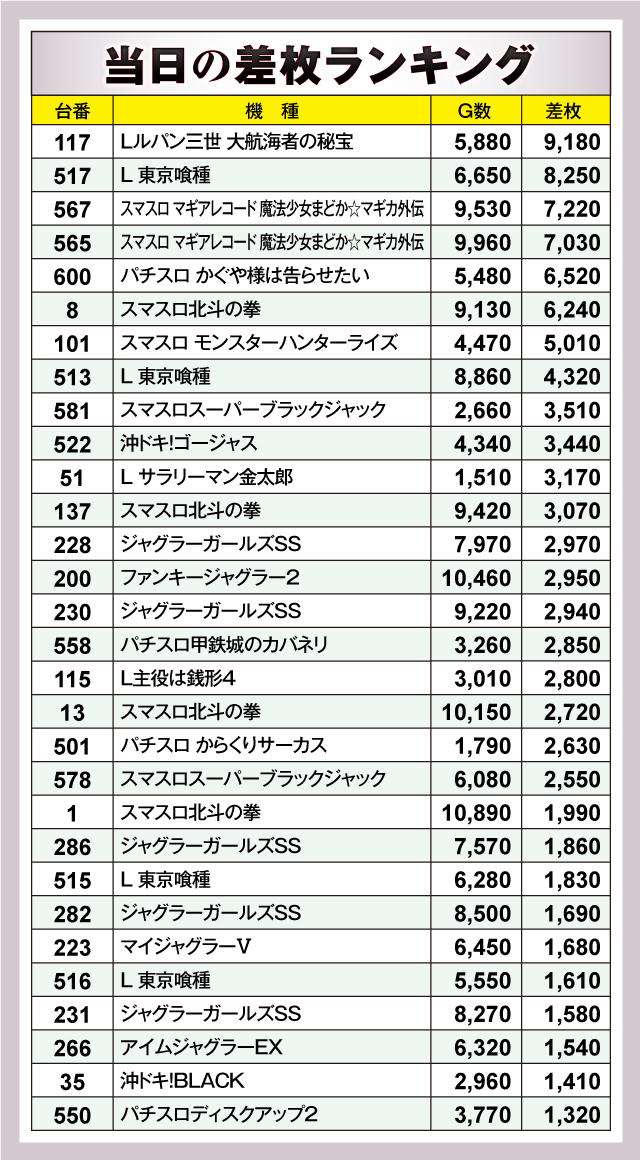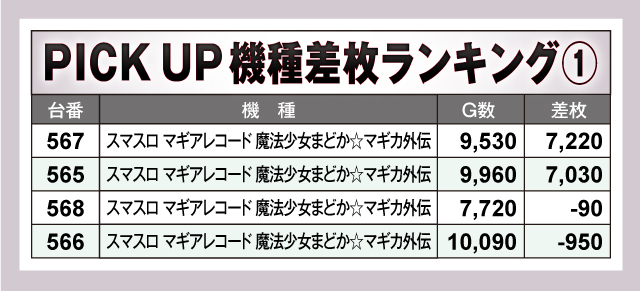 激戦を制したのは『Lルパン三世 大航海者の秘宝』。117番台が+9,180枚と見事な結果を出し首位の座についている。つづいて『L 東京喰種』517番台が+8,250枚。そして『スマスロ マギアレコード 魔法少女まどか☆マギカ外伝』567番台が+7,220枚、565番台が+7,030枚と、文句なしの差枚を叩きだした。