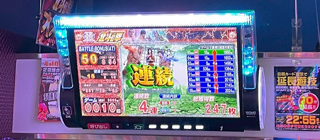 以上が4月10日に実施された「英雄のリアル」である。万枚達成台こそ現れなかったものの、それに近しい好結果の台が多数生まれ、素晴らしい成果をあげていた。稼働の面でも万回転オーバーが続出し、それにともなって閉店まで熱気が衰えることはなかった。今回は鳴りを潜めていた台も、次回以降に躍動する可能性は十二分にある。今後も同店のチェックは欠かさず、次なるチャンスを逃さないように立ち回っていただきたい。