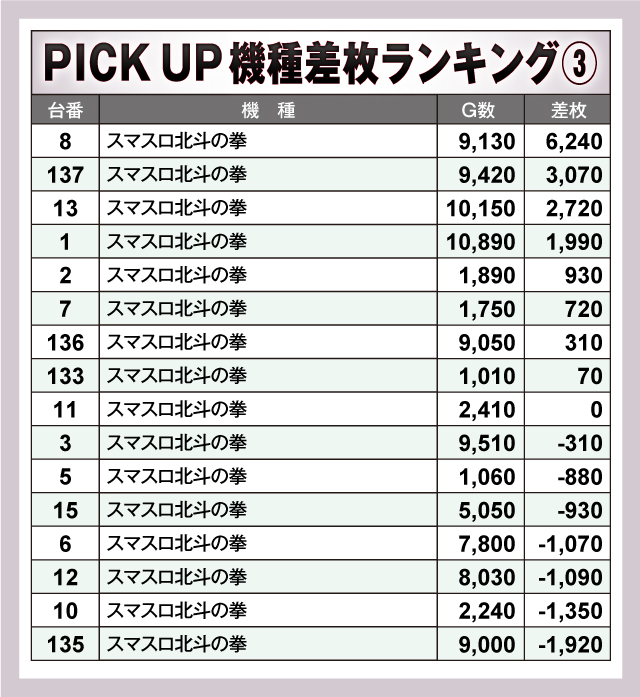 以下、『パチスロ かぐや様は告らせたい』600番台が+6,520枚、『スマスロ北斗の拳』8番台が+6,240枚。さらに『スマスロ モンスターハンターライズ』101番台が+5,010枚と、+5,000枚突破の優秀台がズラリと並ぶ見ごたえ満点のランキングになっている。