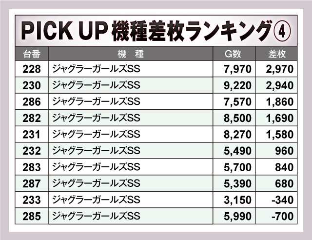 設置台数が多い『スマスロ北斗の拳』はG数少なめの台も見受けられるものの、万回転超えが2台と人気ぶりは健在。同じく人気の『ジャグラー』シリーズから今回は『ジャグラーガールズSS』をピックアップしてみると、熱心に回された様子がうかがえる。差枚の面でも10台中8台がプラスと、期待に応えていたようだ。