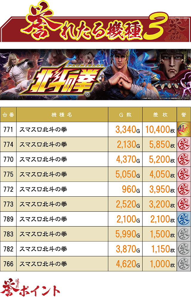 前回以上に大量の誉レコードを生み出したのは『スマスロ北斗の拳』。赤誉マーク5台に、10,000枚超えが1台と、北斗ファンを唸らせる結果を連発した。今後も『北斗』にはまだまだ注目すべき…!?