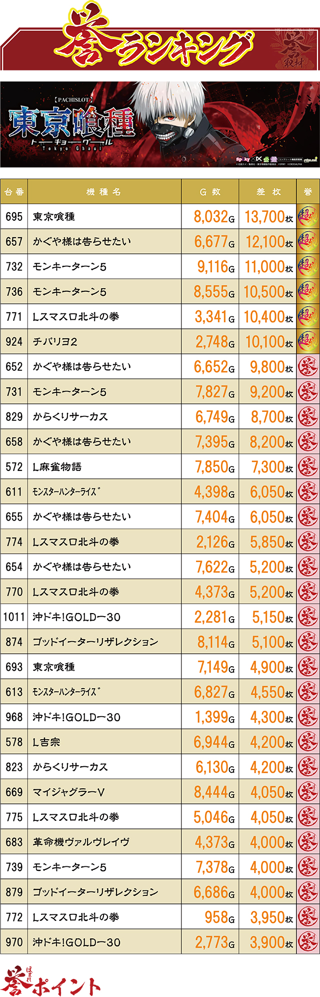なんと6台もの10,000枚オーバー台が誕生したこの日。前回、誉ランキング1位記録の『L東京喰種』が2連続で首位レコードの栄誉に輝いた。またTOP記録はすべて赤誉マーキング(=3,000枚以上)となっており、前回を遥かに上回る結果を披露!