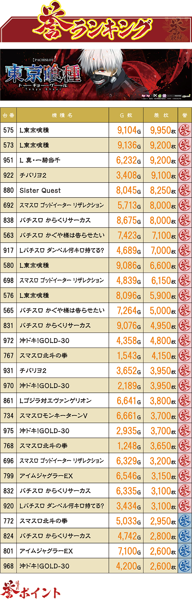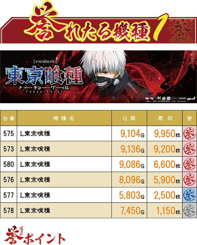 前回4月10日は、『パチスロ 革命機ヴァルヴレイヴ』が1・2フィニッシュを果たし、常連さんを驚かせたが、今回は『L東京喰種』が1位・2位を独占した。それも揃って9,000枚超えという驚異的な記録。なお同機はTOP30ランキング内に計4台がランクイン!