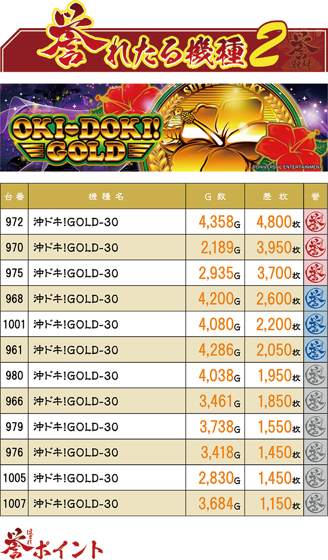この店のパチスロコーナーの中では2番目に設置台数の多い『沖ドキ!GOLD-30』だけあって、誉レコードの総数も12台とかなり多め。前回も多くの誉レコードが生まれていたことを踏まえると、誉取材の日は一番に狙うべき機種なのかもしれない。