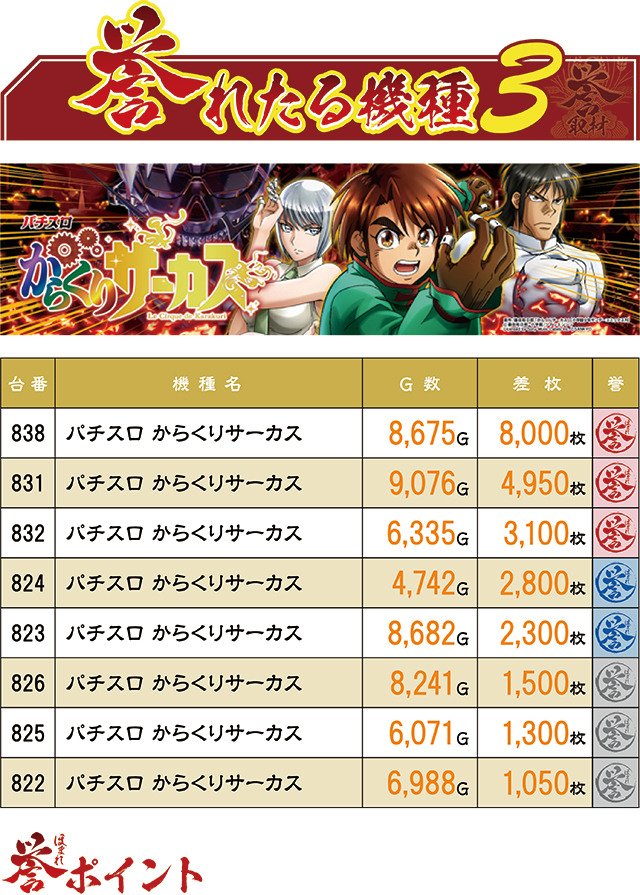 前回も好結果の多かった『パチスロ からくりサーカス』だが、今回はさらに好結果が多く生まれることに。前回は4台だった誉レコードは今回倍の8台に。加えて838番台が8,000枚をマークするなど、その強さが際立った!