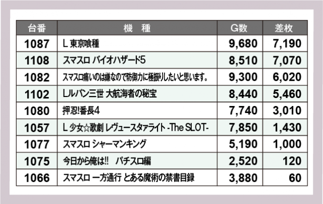 ※差枚数順に掲載しています