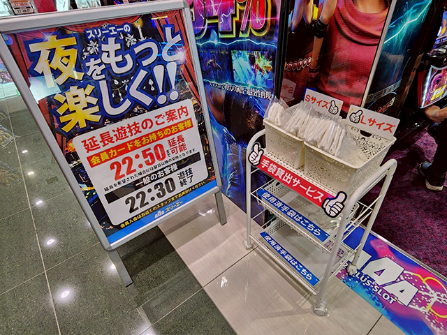 パチスロコーナーのそばで、遊技用の手袋が置かれているワゴンを発見。個包装になっているため、衛生面が気になるプレイヤーでも使いやすそうだ。