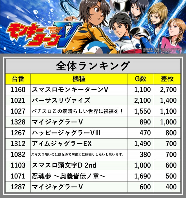 厳選された取材対象機種をはじめ、その他スロット全体から好記録が飛び出した!プレイヤーが楽しんだ1日を下記データにて振り返ってみて欲しい。