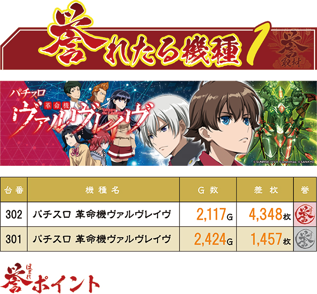3台設置の『パチスロ 革命機ヴァルヴレイヴ』は、2台が誉レコード(=1,000枚以上)に。302番台がすこぶる快調で、難なく4,000枚を超える差枚結果を実現した。