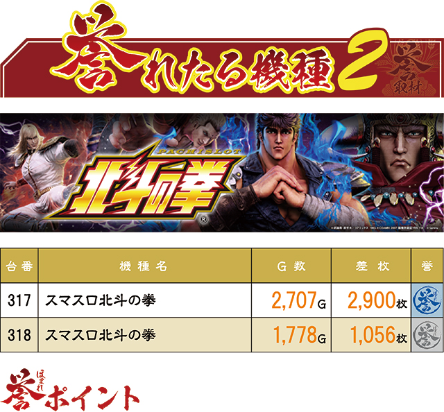 前回と同じく、またしても『スマスロ北斗の拳』からは2台の誉レコードが誕生。残念ながら赤誉マーク(=3,000枚以上)は生まれなかったものの、次回の誉取材の日も『北斗』から複数のプラス差枚が生まれそうな気配…。