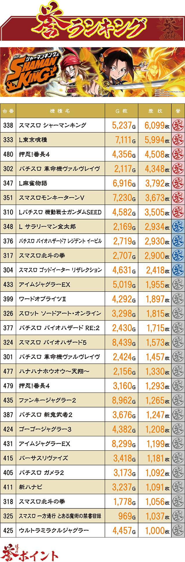 前回は『L麻雀物語』、今回は『スマスロ シャーマンキング』が誉ランキングの1位の座に君臨するなど、2連続でバラエティー機種が快挙を達成!これは1台機種にも十分なチャンスがあることを示しており、朝の抽選番号で爆死しても戦えることを意味している。なお2位以下の記録には人気マシンの名が並んでおり、多台数機種にもチャンスがあったようだ。
