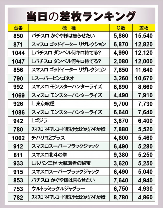 『パチスロ かぐや様は告らせたい』『スマスロ ゴッドイーター リザレクション』『Lパチスロ ダンベル何キロ持てる?』『Lスーパービンゴネオ』の合計6台から万枚OVERが飛び出し、当日の館内の盛り上がりをリード。さらに『スマスロ モンスターハンターライズ』なども大台突破で続いており、凄まじい熱気が包み込んでいた様子が窺える。終日を通して打ち込まれた形跡も見られ、ファンは有意義な時間を過ごしていたに違いない。