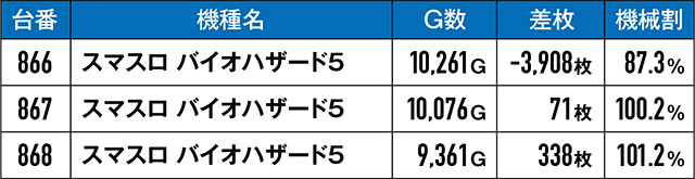 3台設置の『スマスロ バイオハザード5』の結果は振るわず…。3台とも9,000G以上回されはしたものの、思うような結果にはならなかった。