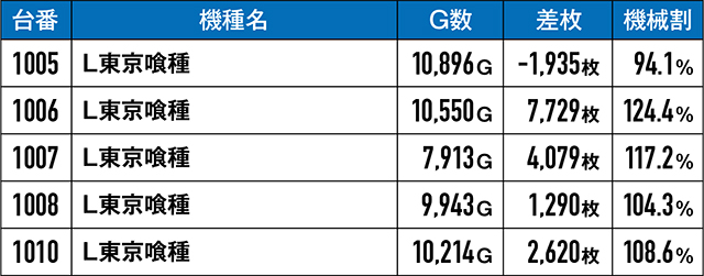 好調ムードが思いっきり結果にも表れていたのは『L東京喰種』。1005番台のみマイナスとなってしまったが、1006番台が7,500枚オーバー、1007番台が4,000枚オーバーと、マイナス台の失態を補って余りある活躍を披露してくれた。