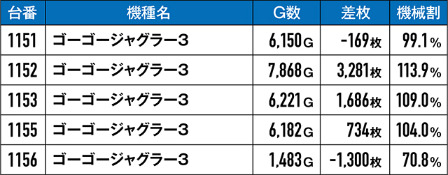 1152番台が3,000枚を上回る見事な結果を見せてくれた。その機械割はまさかの113.9%!お隣の1153番台もコンスタントにGOGOランプをペカらせていたが、機械割が110%を超えることは惜しくも叶わなかった。