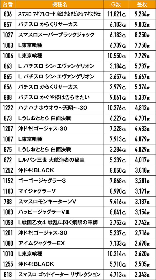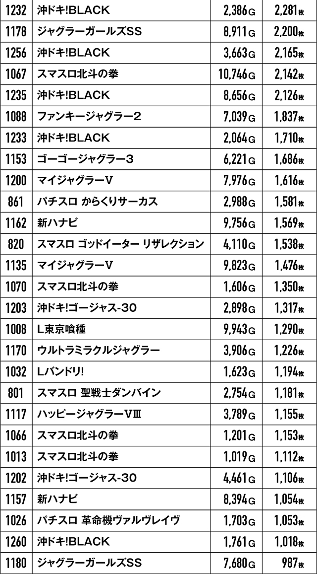 5,000枚オーバー記録は、前回よりもやや減ってしまったが、それでも9台!3,000枚オーバー台に至っては計20台を数え、常連ユーザーを満足させるに十分な結果だった。また、1~2台設置のバラエティー機種がプラっていたのは、バラエティー島にもチャンスがあったという証だろう。