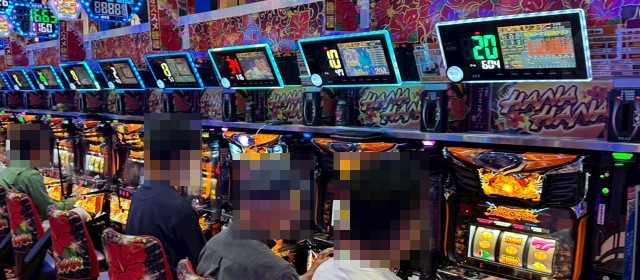 まずは20スロをチェック。前回・前々回と、ボーナス回数の多さが目立っていた沖スロコーナーに向かった。