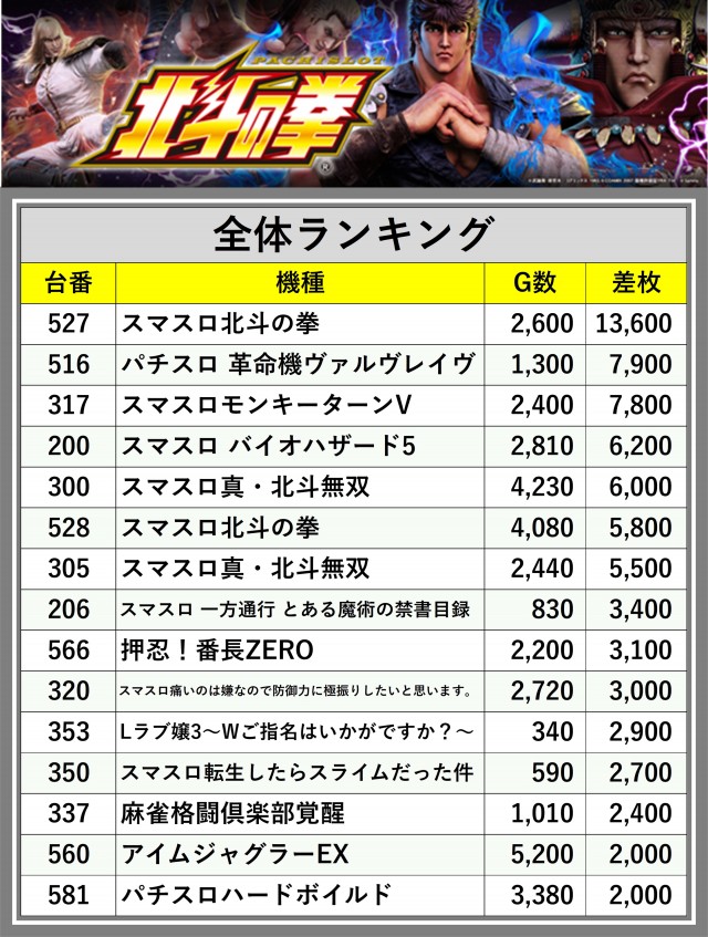 厳選された取材対象機種をはじめ、その他スロット全体から好記録が飛び出した!プレイヤーが楽しんだ1日を下記データにて振り返ってみて欲しい。
