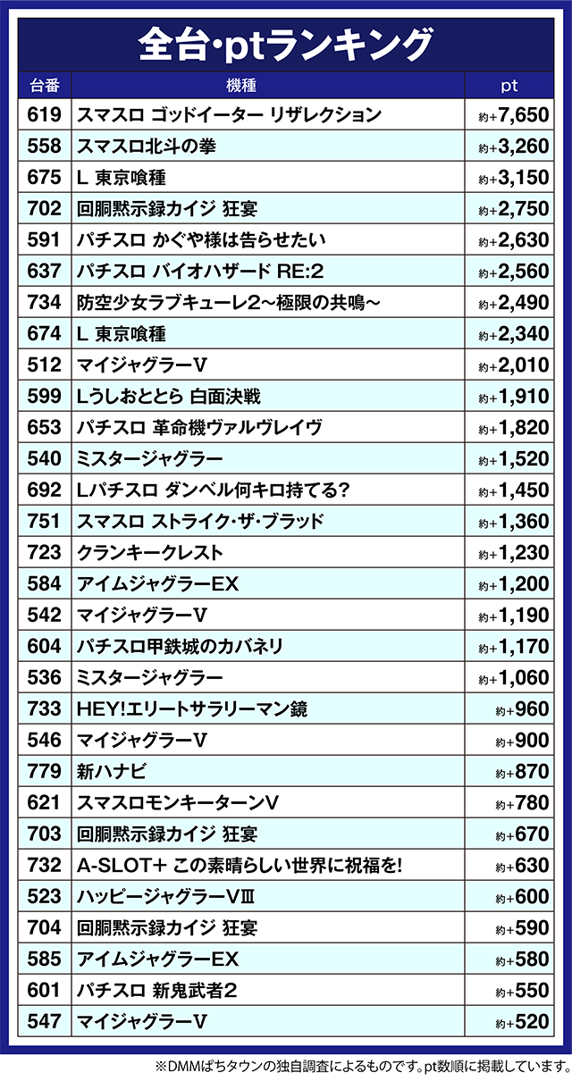 ほかにも、「回胴黙示録カイジ 狂宴」の702番台や「パチスロ かぐや様は告らせたい」の591番台などが約+2,000ptオーバー。