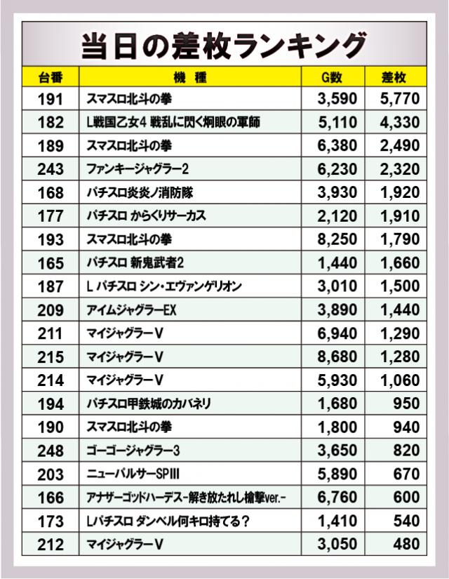 当日の差枚ランキング